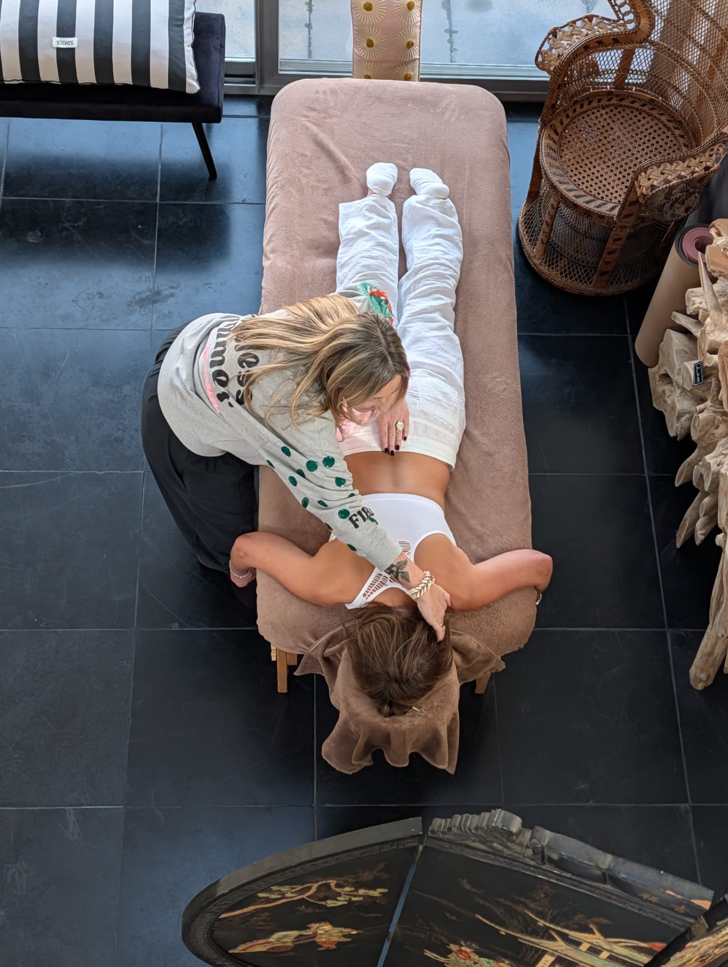 Daarna lig je volledig gekleed op je buik op de behandeltafel. Via zachte aanrakingen en energetisch werk langs de ruggengraat wordt de energie opnieuw in beweging gebracht. Dit activeert het zelfherstellend vermogen van je lichaam en helpt spanning, opgeslagen emoties en stress los te laten.